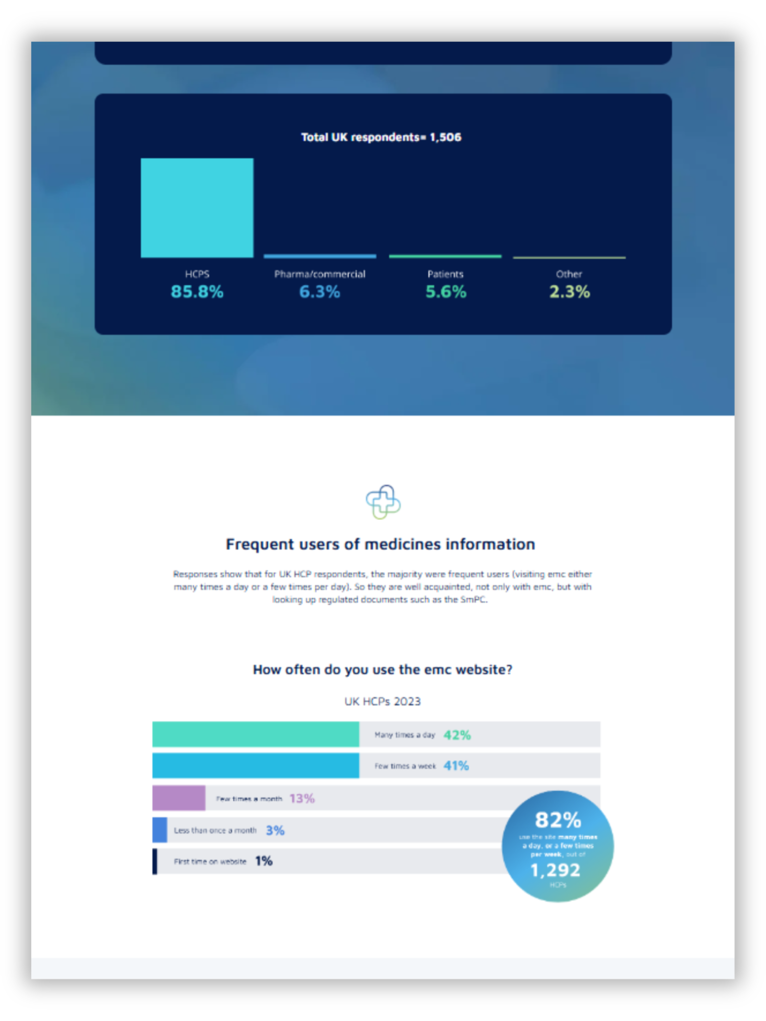 Since 2020, the annual emc user survey has been an important resource for identifying how to best meet HCPs' needs for medicine information content. With millions of HCPs and patients visiting emc (electronic medicines compendium, medicines.org.uk) annually, it has become the logical platform for finding unique insights from these frequent users of medicines information.