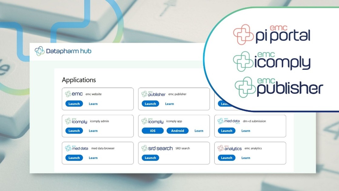 The Datapharm Hub is a Single Sign-on (SSO) point of easy access to Datapharm’s emc applications; here you can access the services you take from us or learn more about the ones you don’t currently take.